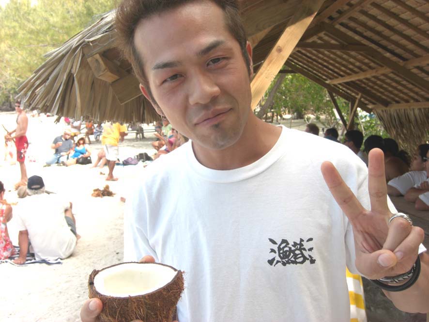 いきなりココナッツ割り大会が始まって、マサヤが日本代表で連れ出されました(笑)